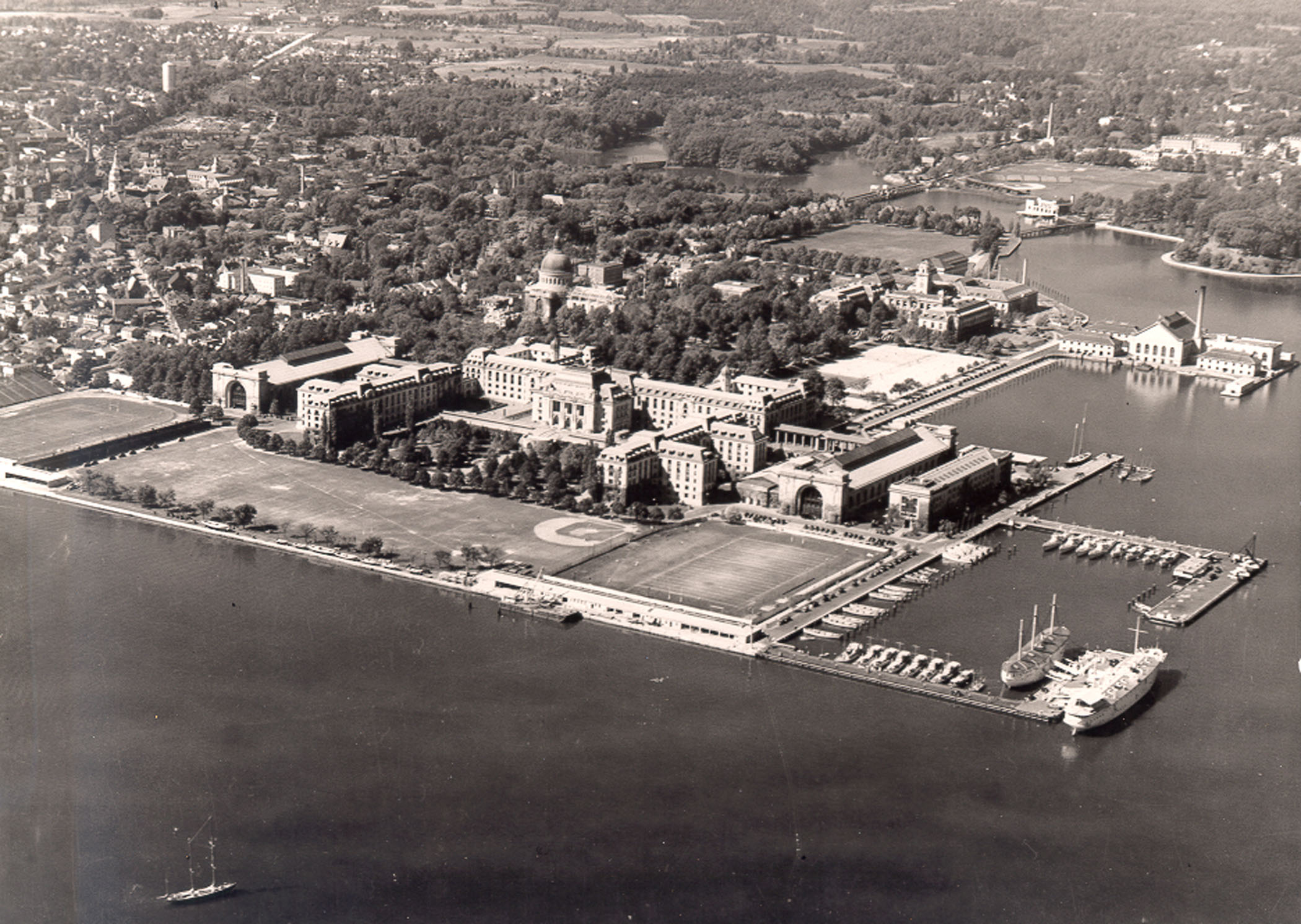 Natatorium (1924) and Hubbard (1930), Melville (1937), Leahy (1939) and Preble (1939) Addition to the Chapel (1940), Yacht America alongside pier in Dewey Basin NEXT page For End of Show-click LAST