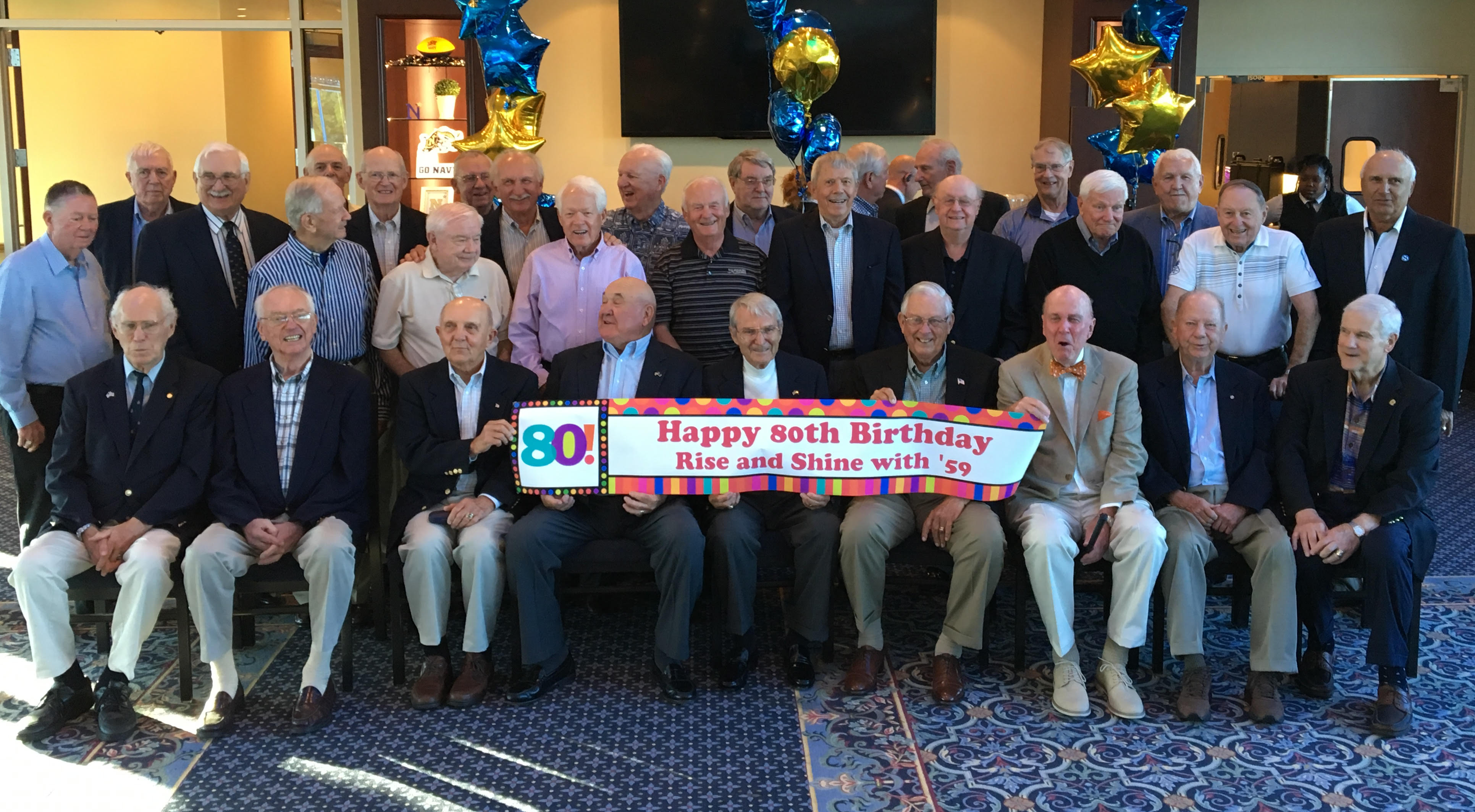 On September 13, 2016, the 80th Birthday Celebration was held at the Navy-Marine Corps Memorial Stadium. Classmates, spouses and guests attended from six states - Delaware, Florida, Maryland, North Carolina, Pennsylvania, Virginia, and the District of Columbia with 56 in attendance, including 31 classmates and 23 spouses. Cocktails were at 5:30PM and dinner at 6:00PM. A great time was had by all -- HAPPY 80th BIRTHDAY!
